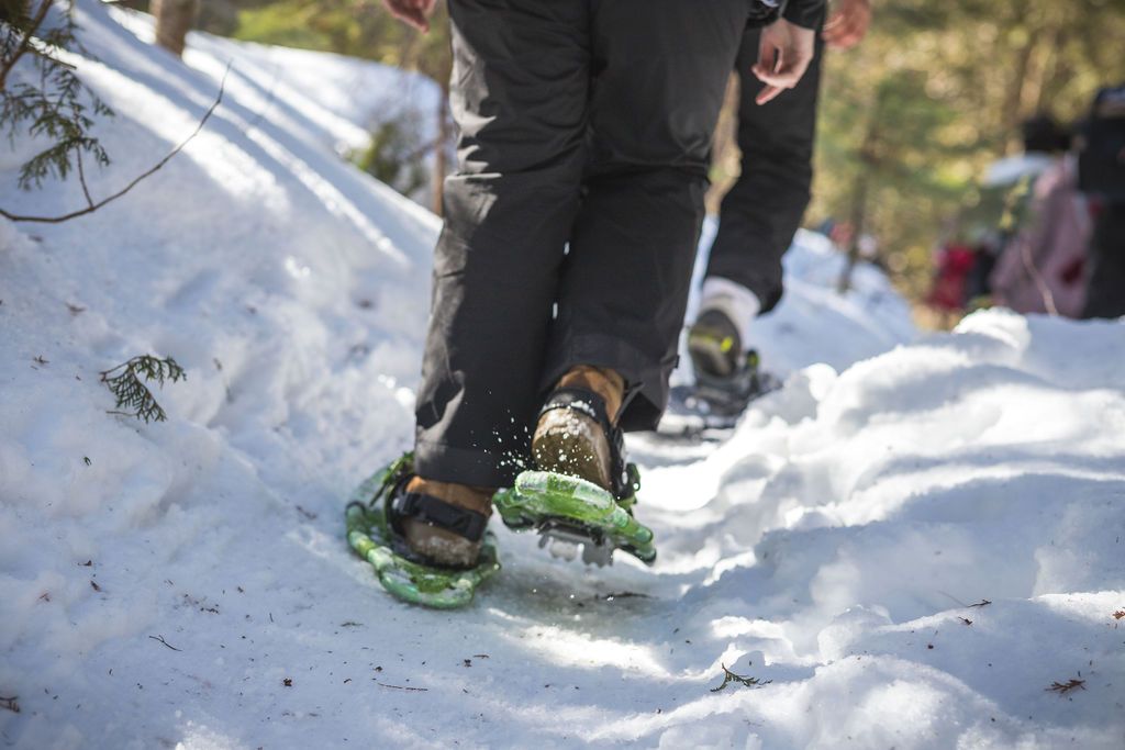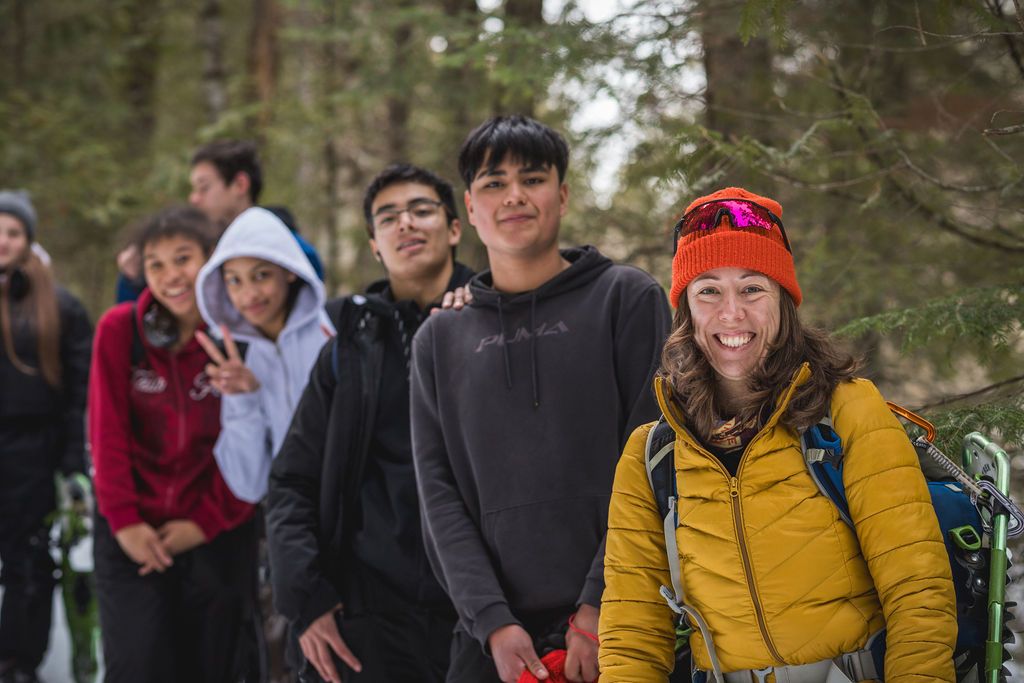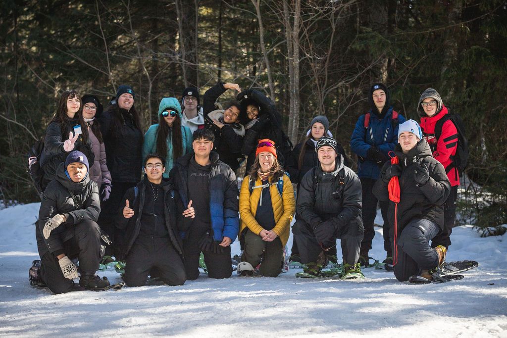 Nous avons commencé la deuxième journée par une randonnée en raquettes. Avant d’entrer dans le sentier, j’ai demandé aux jeunes de vérifier que leurs raquettes étaient correctement attachées. Deux personnes les avaient mises à l’envers. Nous avons ri, pris une photo de groupe avec l’arrivée de notre photographe préférée, Geneviève Locas, puis nous sommes partis.